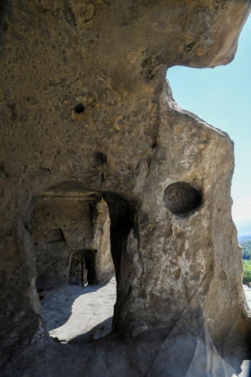 De stad diende als woonplaats voor de heersende klasse, zoals deze grotwoning met driehoekige daktop. Uplistsikhe, wat "de Fort van de Heer" betekent dateert uit de 6e eeuw