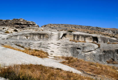 tunnels en kamers die uit de rotswand van de Erusheti-berg zijn
