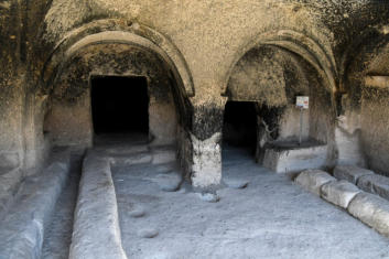 zonnetempel. Het grottencomplex bevat heidense offer plaatsen en functionele gebouwen zoals een bakkerij, een gevangenis, kelders en zelfs een amfitheater, allemaal verbonden