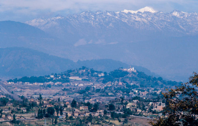 omliggende bergen, staat de eeuwenoude stupa Swayambhunath, in de volksmond bekend als de “Monkey