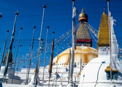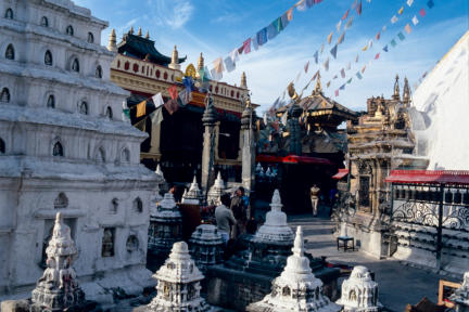 tempels en heiligdommen, de iconische stupa waarvan de ogen van Boeddha in alle vier de windrichtingen kijken, symbool staand voor de alwetendheid van Boeddha. Rond de stupa ligt een cirkelvormig dorpje waar vooral