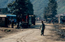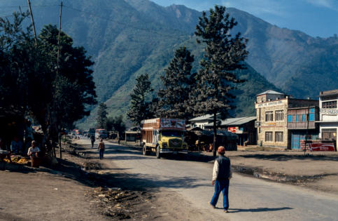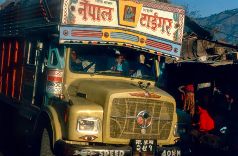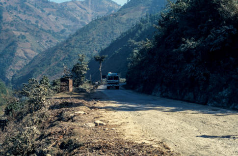 Prithivi Highway. De lijnbus doet ongeveer 7:30 over het traject. Traag klimt de bus over de heuveltoppen, moeizaam passeren de vrchtwagens over de soms erg smalle weg. De staat van deze Highway laat veel te wensen over, rond