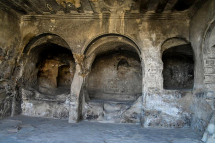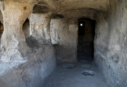 tunnels en kamers die uit de rotswand van de Erusheti-berg zijn